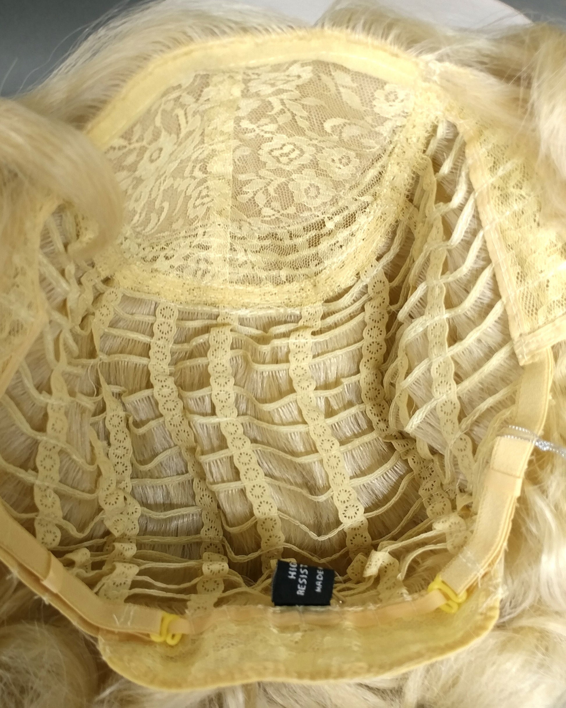 Short bob wig with vintage-style waves and off-center, light-color faux skin part. Inside cap has adjustable elastic straps, no combs or clips. Heat-resistant at 350F.